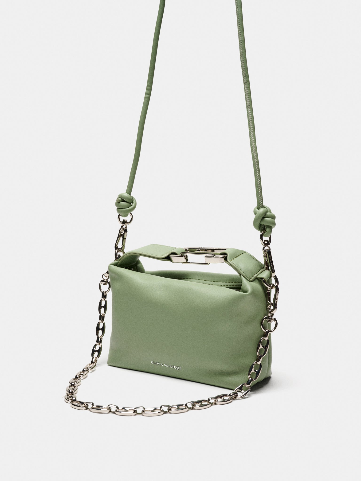 Un bolso pequeño y versátil que se adapta a cada ocasión: llévalo cruzado como bandolera o de mano para un look más elegante. Su diseño en piel vegana verde con cierre de mosquetón metálico logotipado lo convierte en un accesorio sofisticado y con personalidad.
